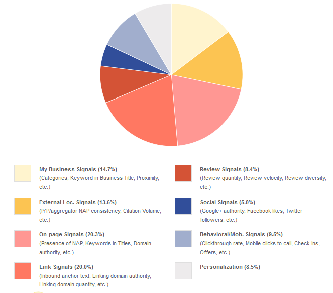 - On-page signals are roughly the same as local signals detected through links off-page. (20% each)